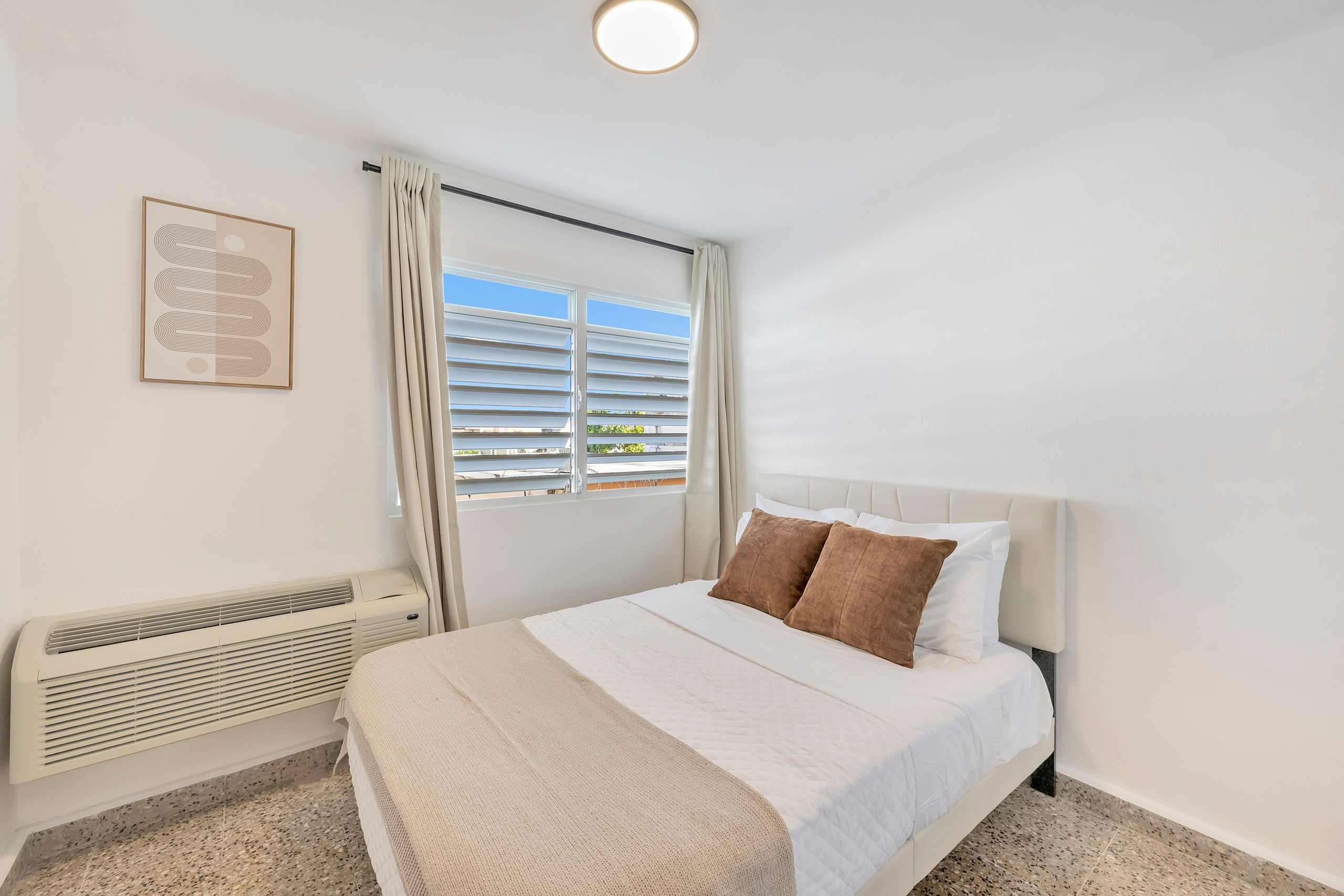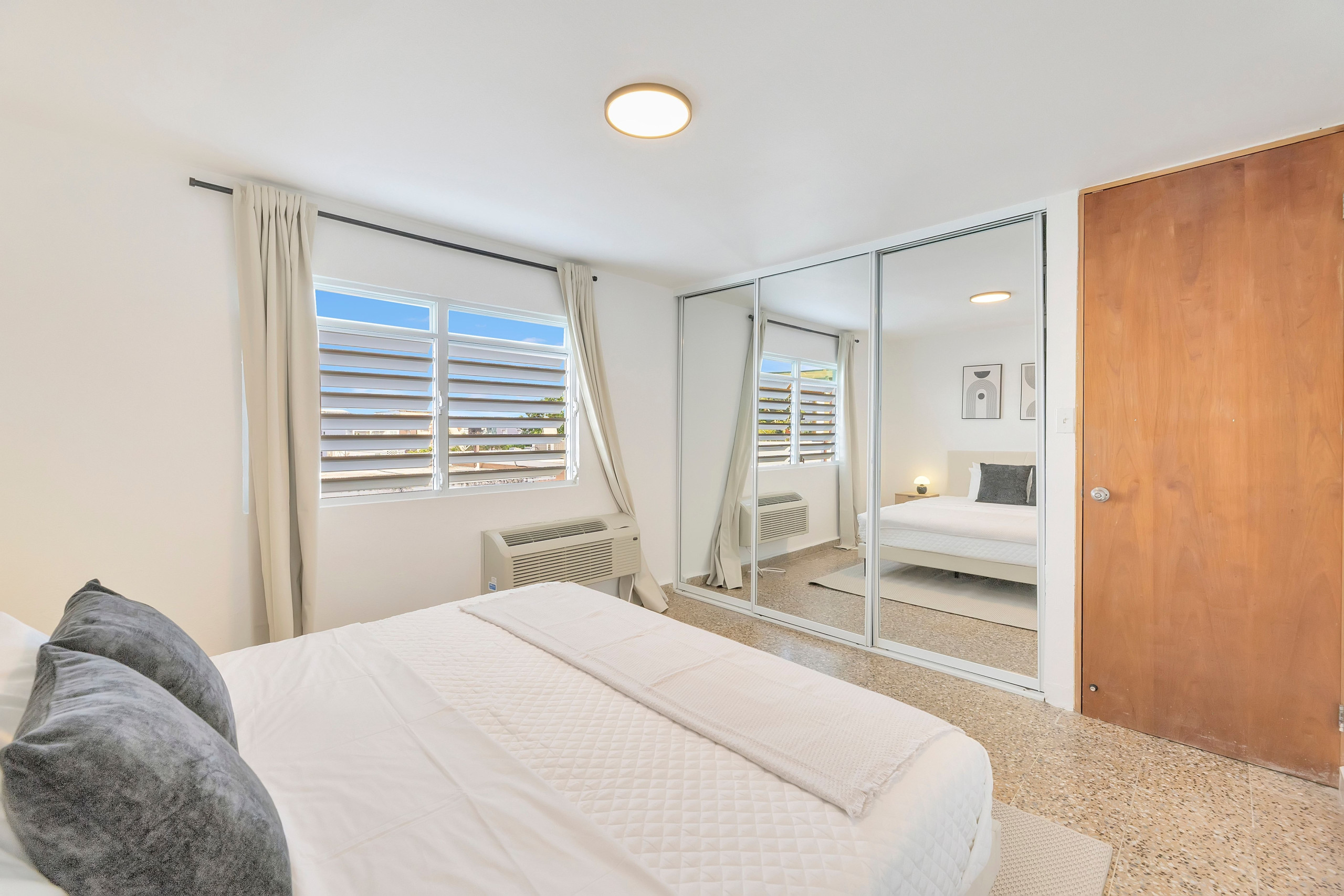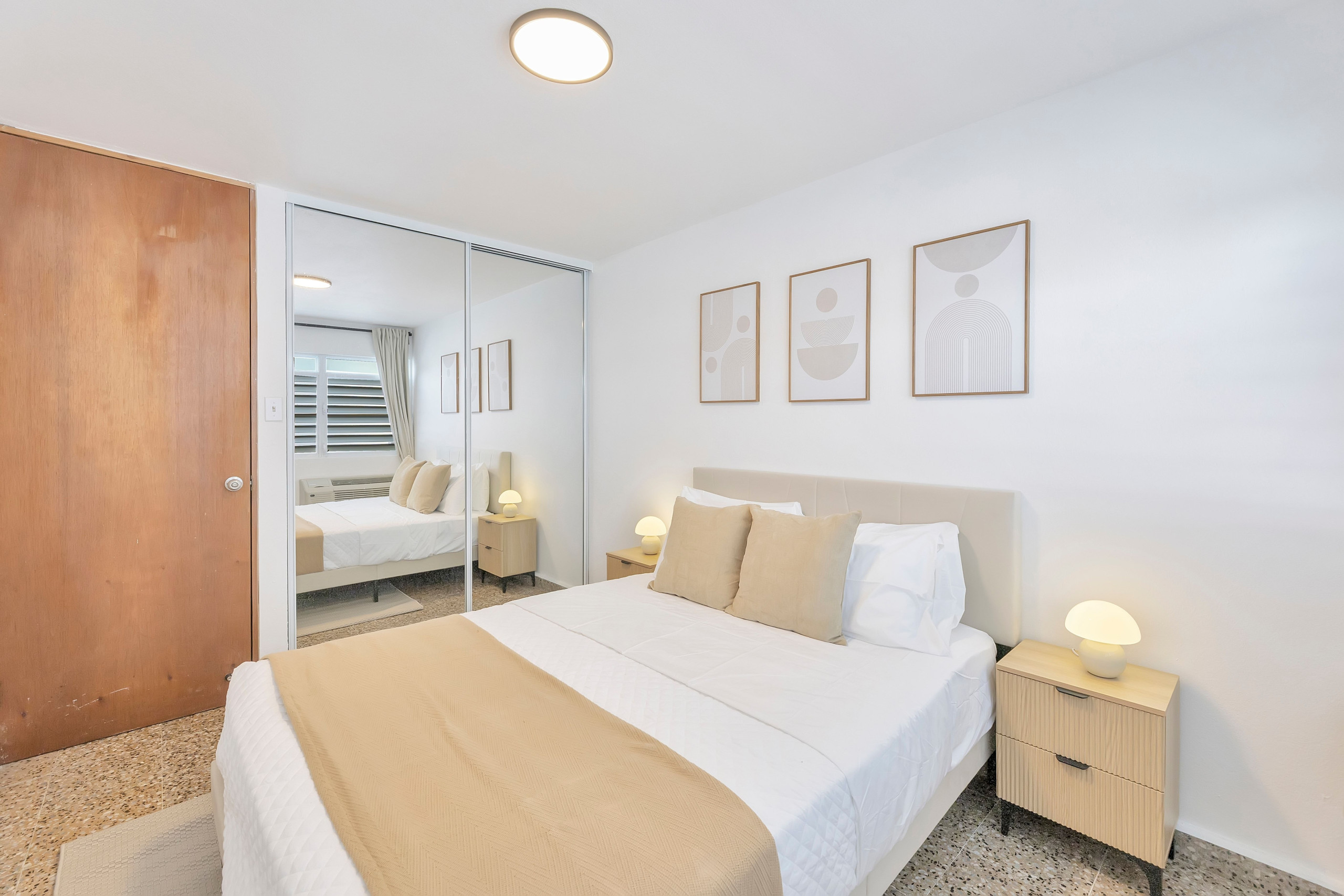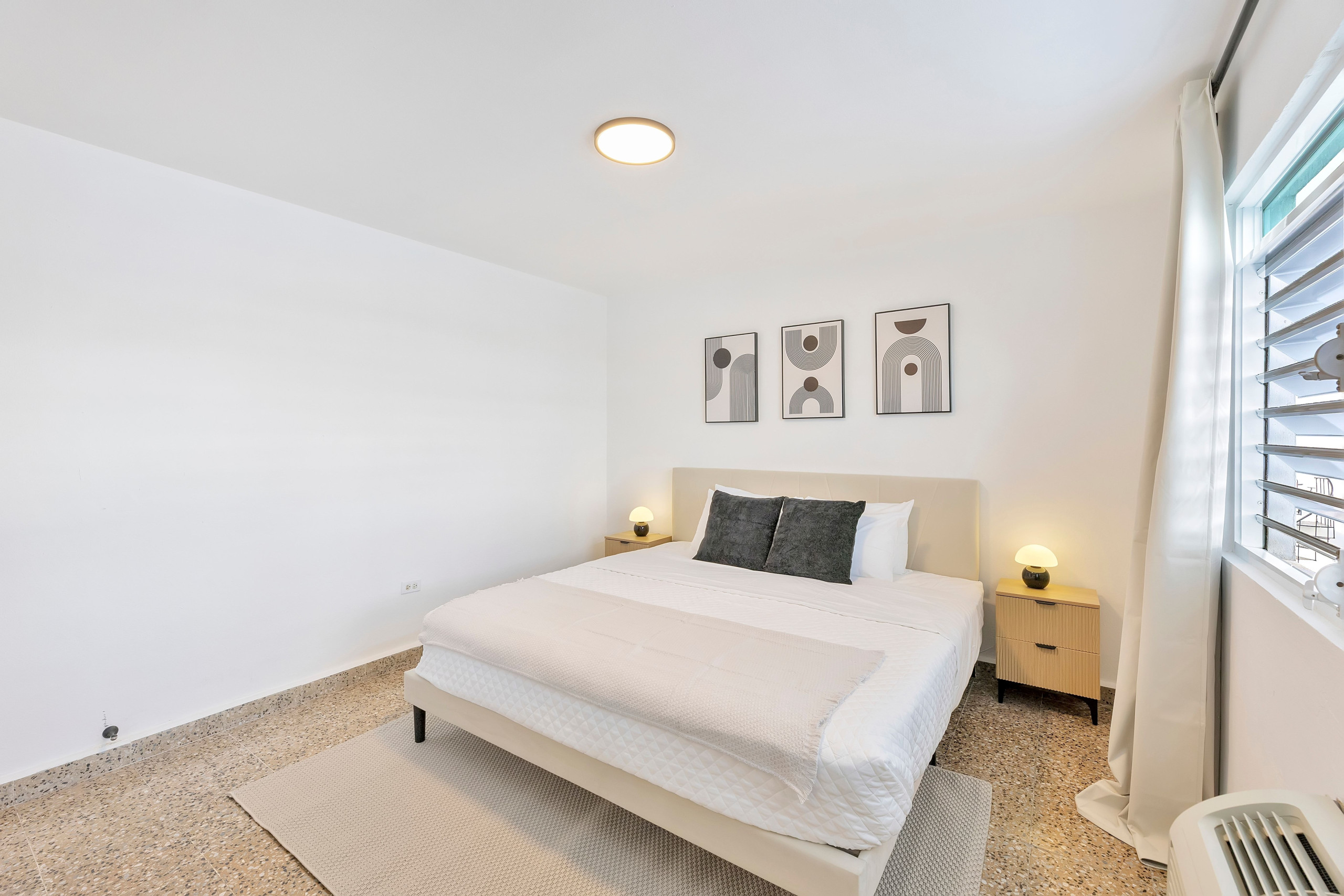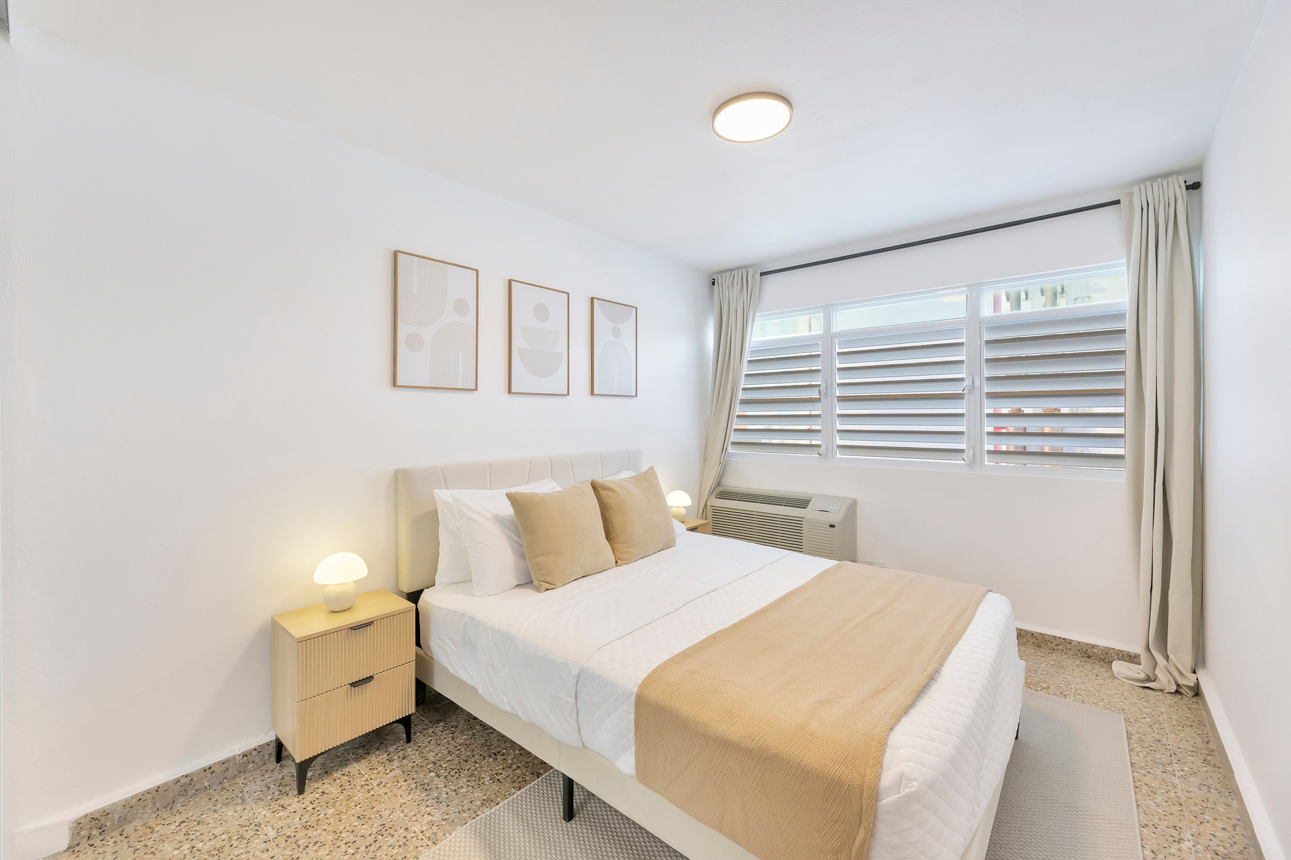 El apartamento cuenta con tres dormitorios con una variedad de opciones de alojamiento, incluyendo una cama king-size, una cama queen-size, una cama doble y un sofá-cama doble, ideal para grupos que viajan juntos. Cada habitación incluye espacio de armario y aire acondicionado para una estancia cómoda. Tenga en cuenta que la sala de estar no tiene aire acondicionado.