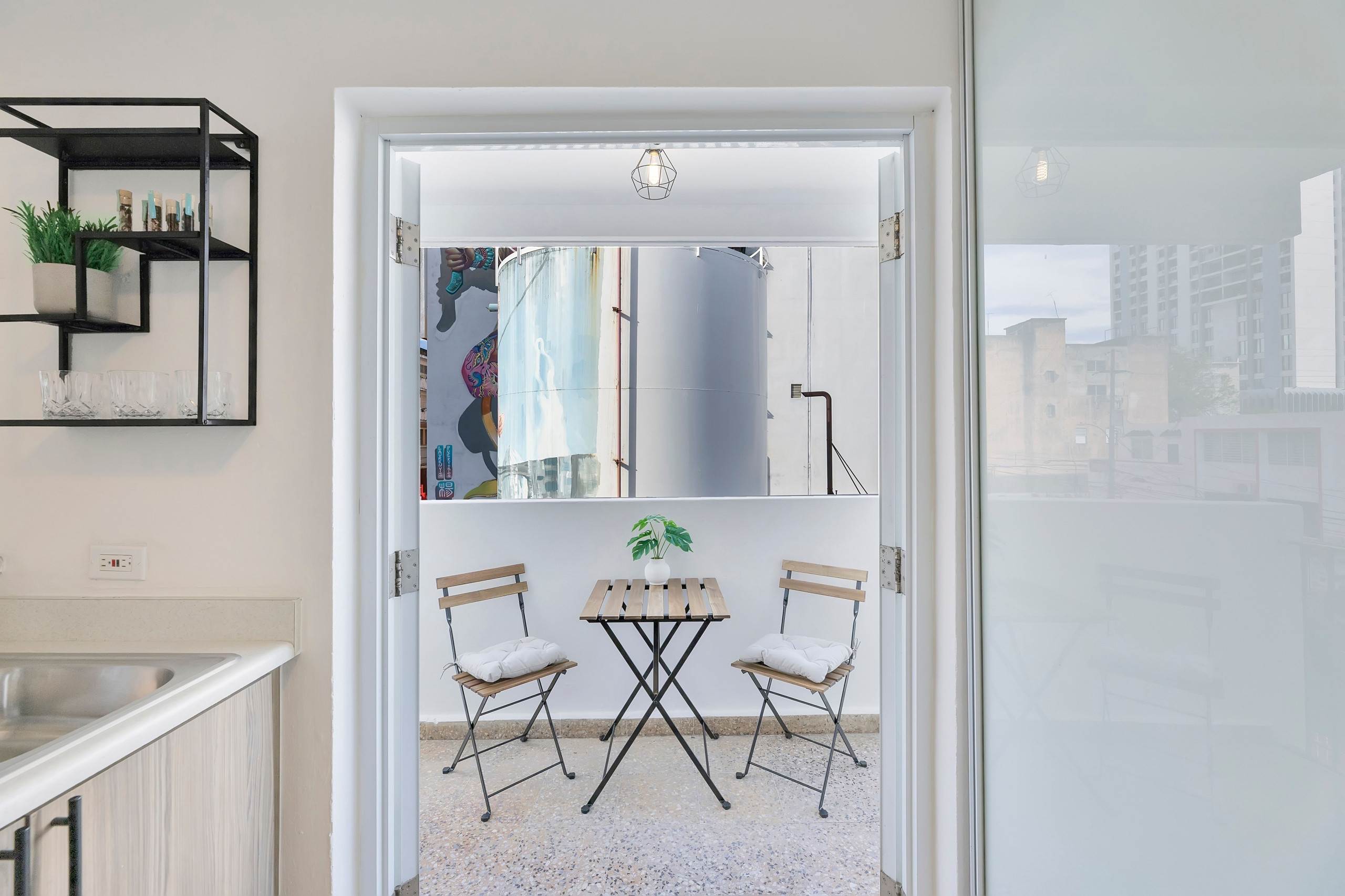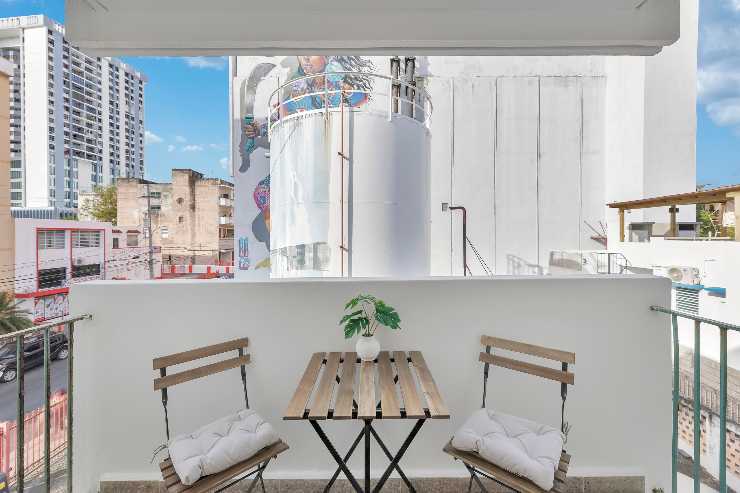 Salga al balcón amueblado para relajarse, disfrutar de su café matutino o descansar con una bebida mientras disfruta de las vibraciones de la ciudad.