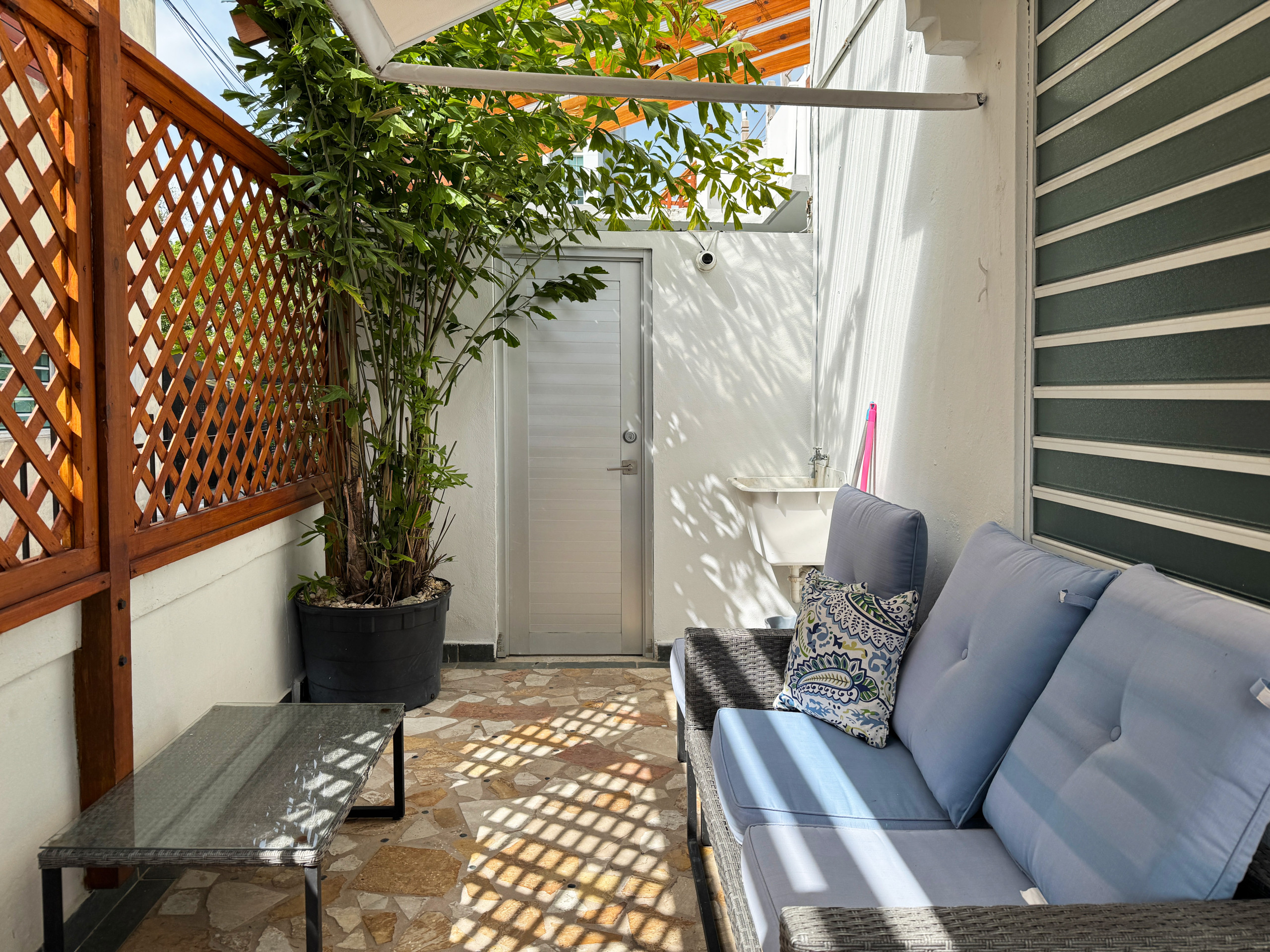Relájese en nuestro patio paisajista, con brisas frescas del Parque de la Laguna de Condado, ubicado justo al lado. Después de un día en la playa, quítese la arena en nuestra ducha exterior ubicada en el patio.