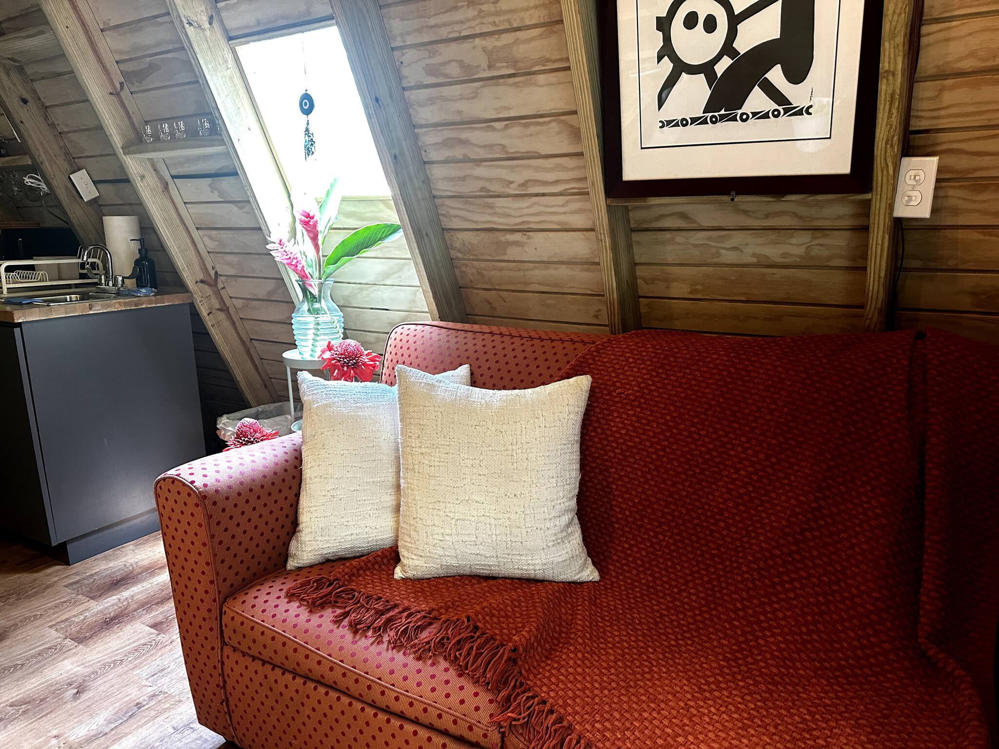 En el interior, encontrarás un espacio diseñado con esmero que combina el encanto rústico con las comodidades modernas. El cabina cuenta con una zona de estar confortable, un acogedor altillo dormitorio y una cocina totalmente equipada donde podrás preparar tus comidas utilizando ingredientes locales.