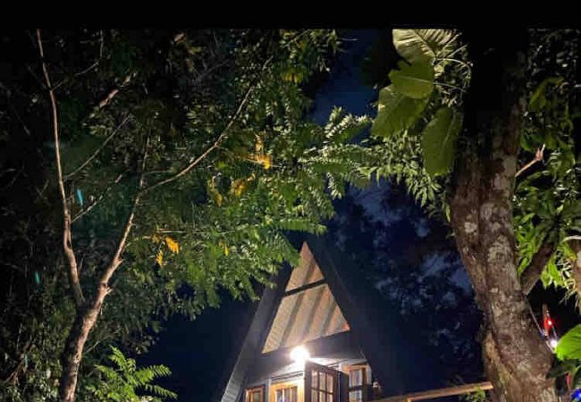 La cabaña tiene una entrada privada rodeada de naturaleza y una enorme vista nocturna desde el balcón.