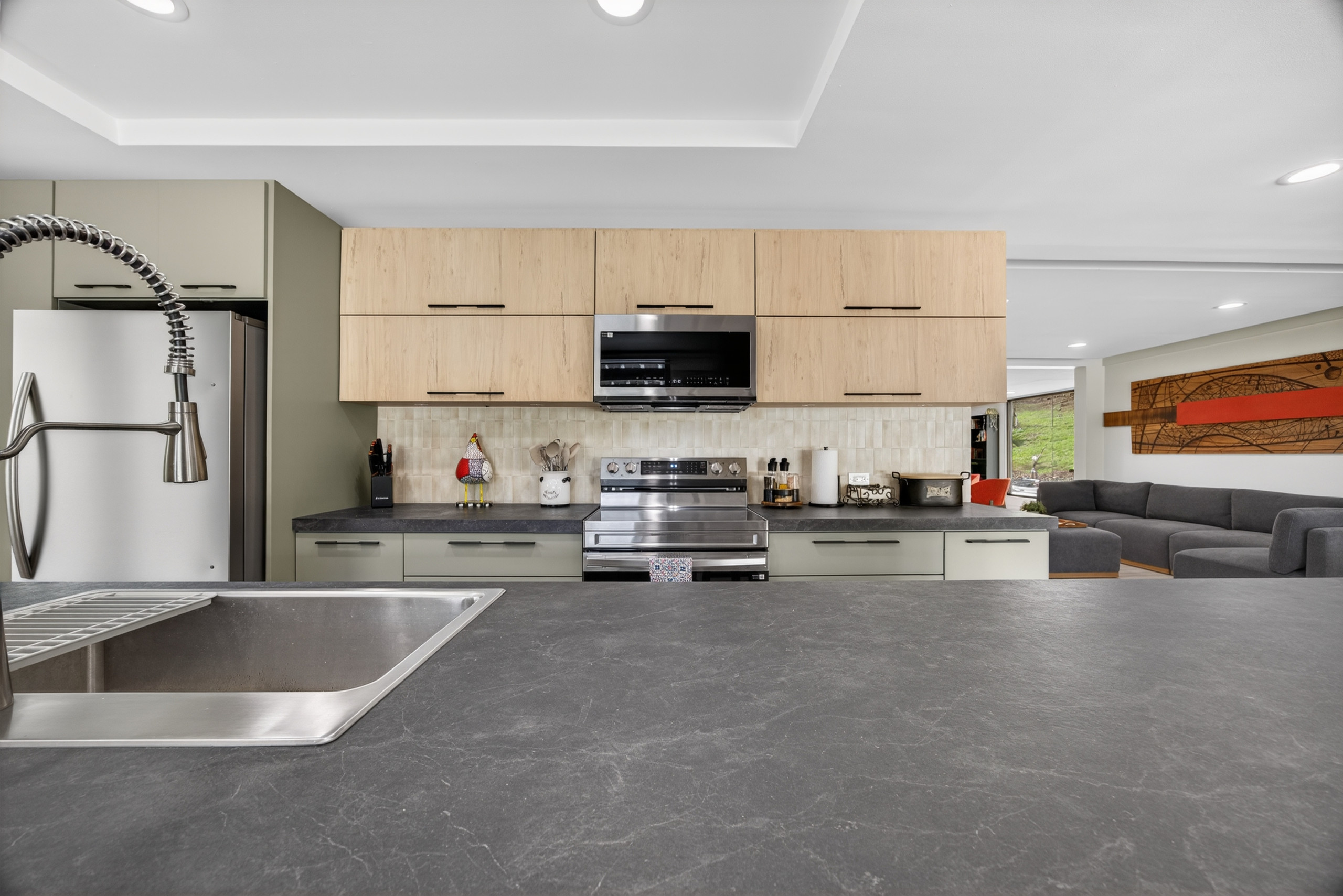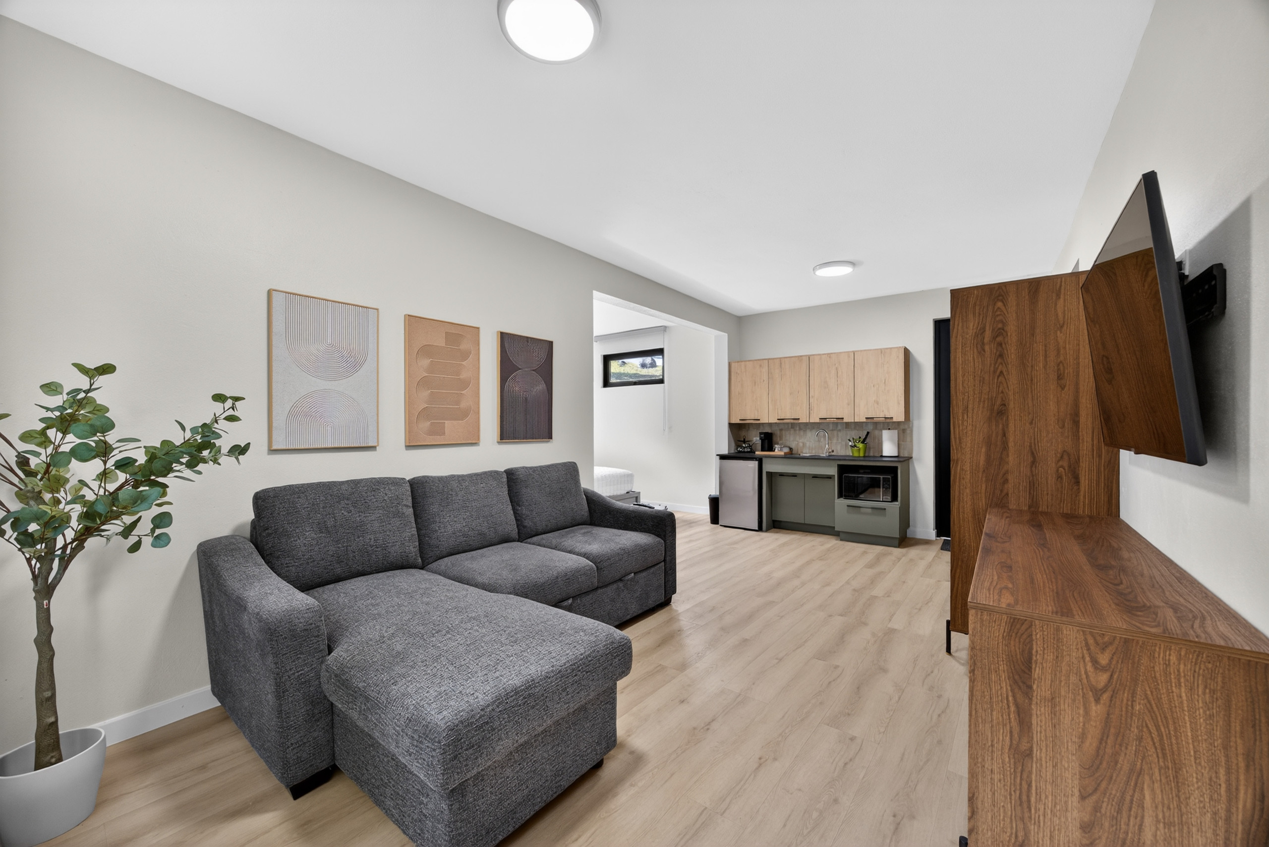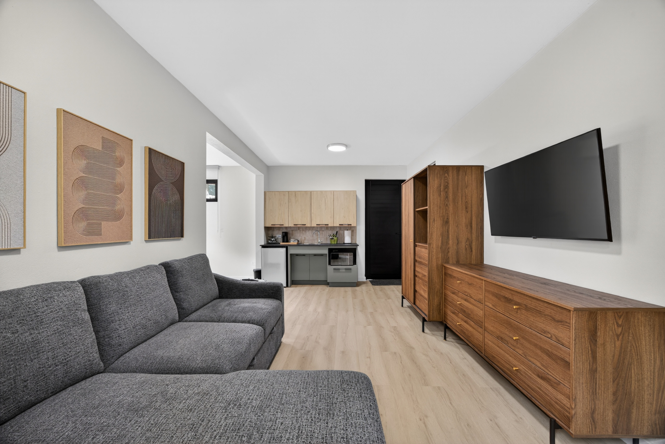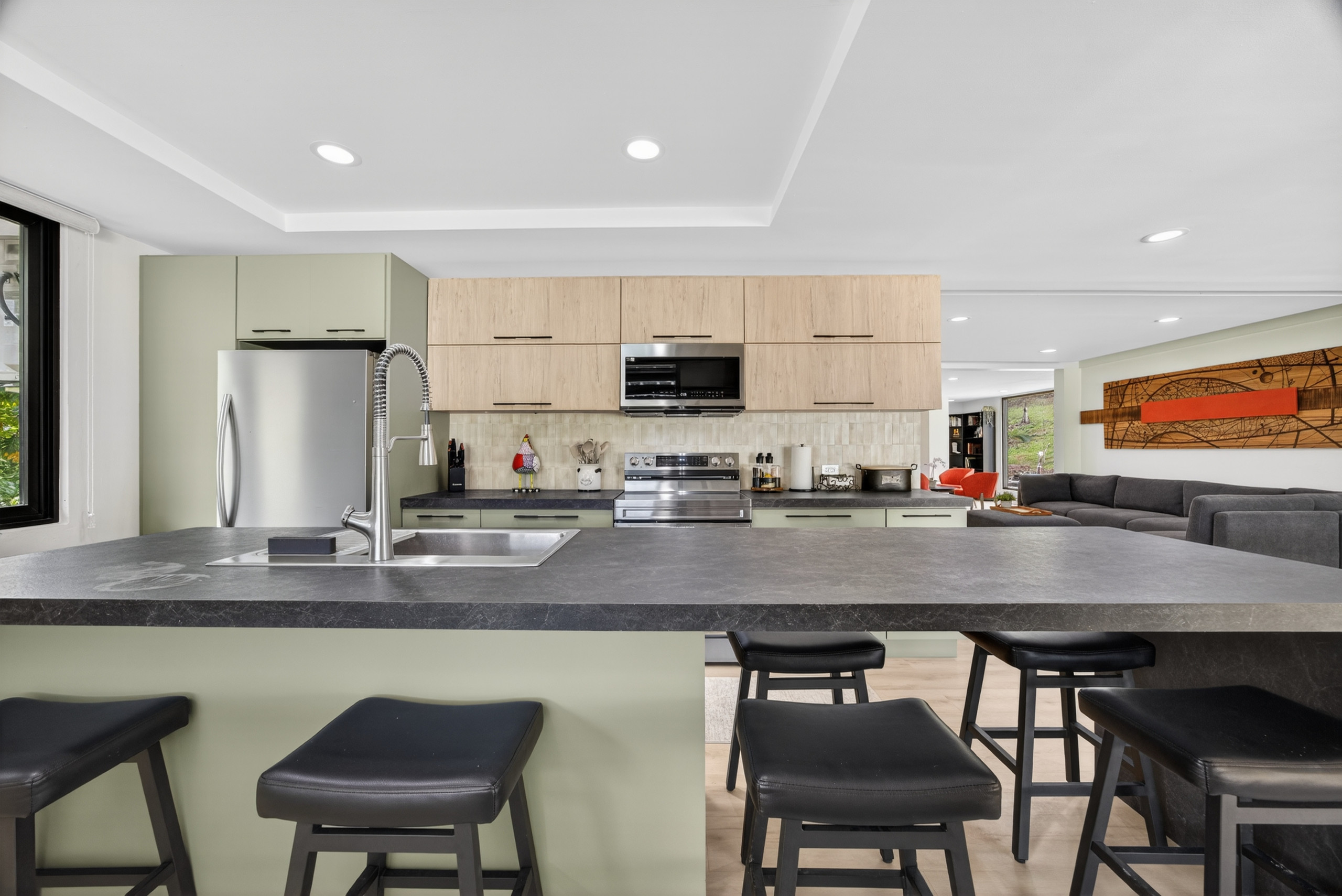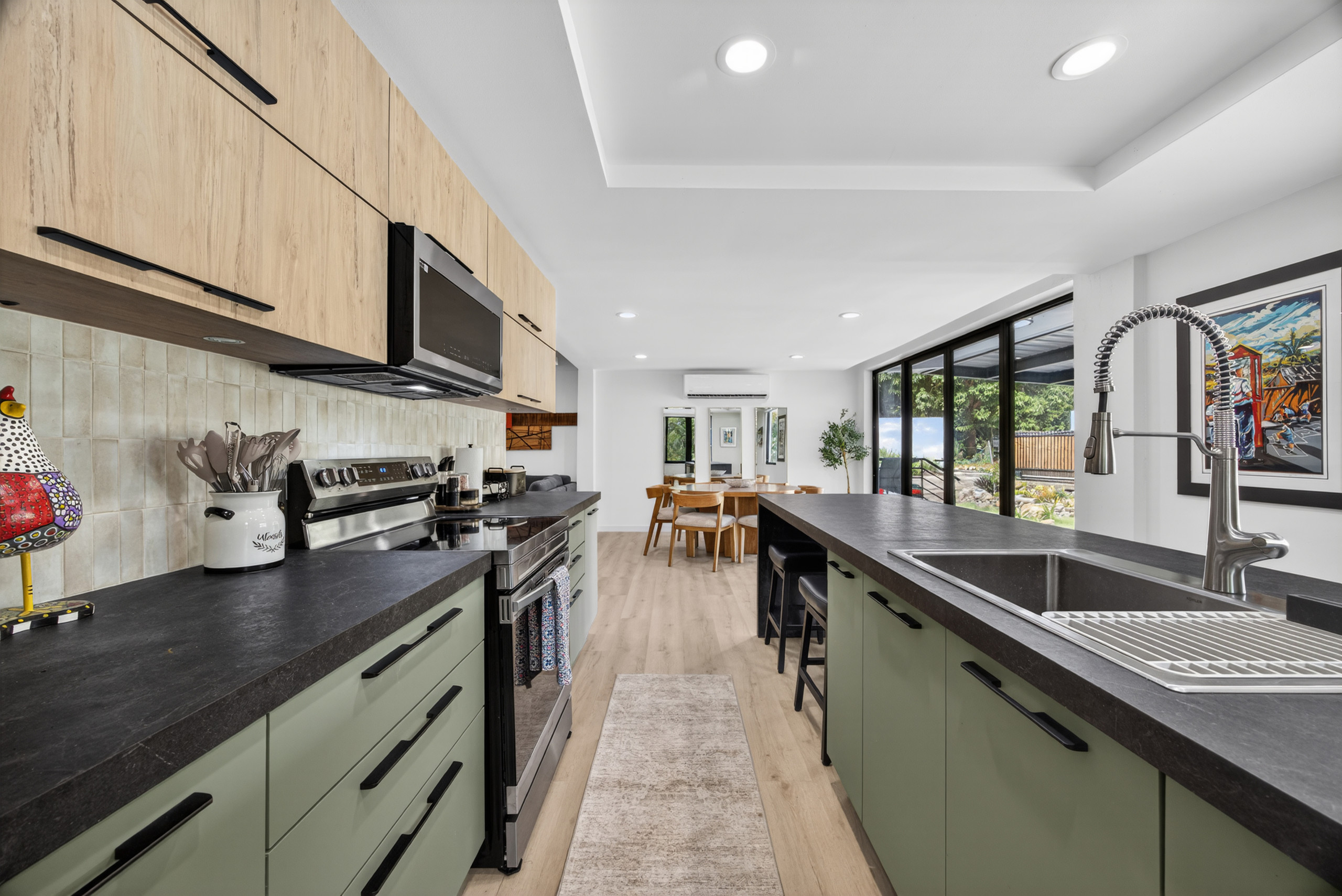 En el interior, encontrarás Wi-Fi de alta velocidad, tres televisores y áreas comunes cómodas diseñadas para estancias grupales. La cocina eléctrica completamente equipada es perfecta para grupos grandes y estancias prolongadas, ofreciendo un refrigerador, horno, microondas, congelador, cafetera, tostadora, hervidor, utensilios de cocina y vajilla completa; todo lo necesario para preparar comidas en casa.
