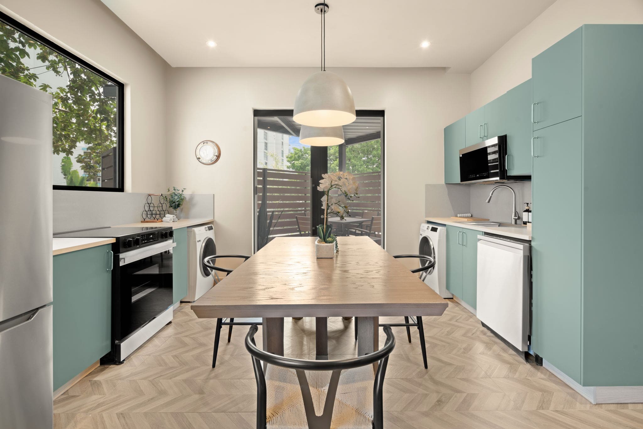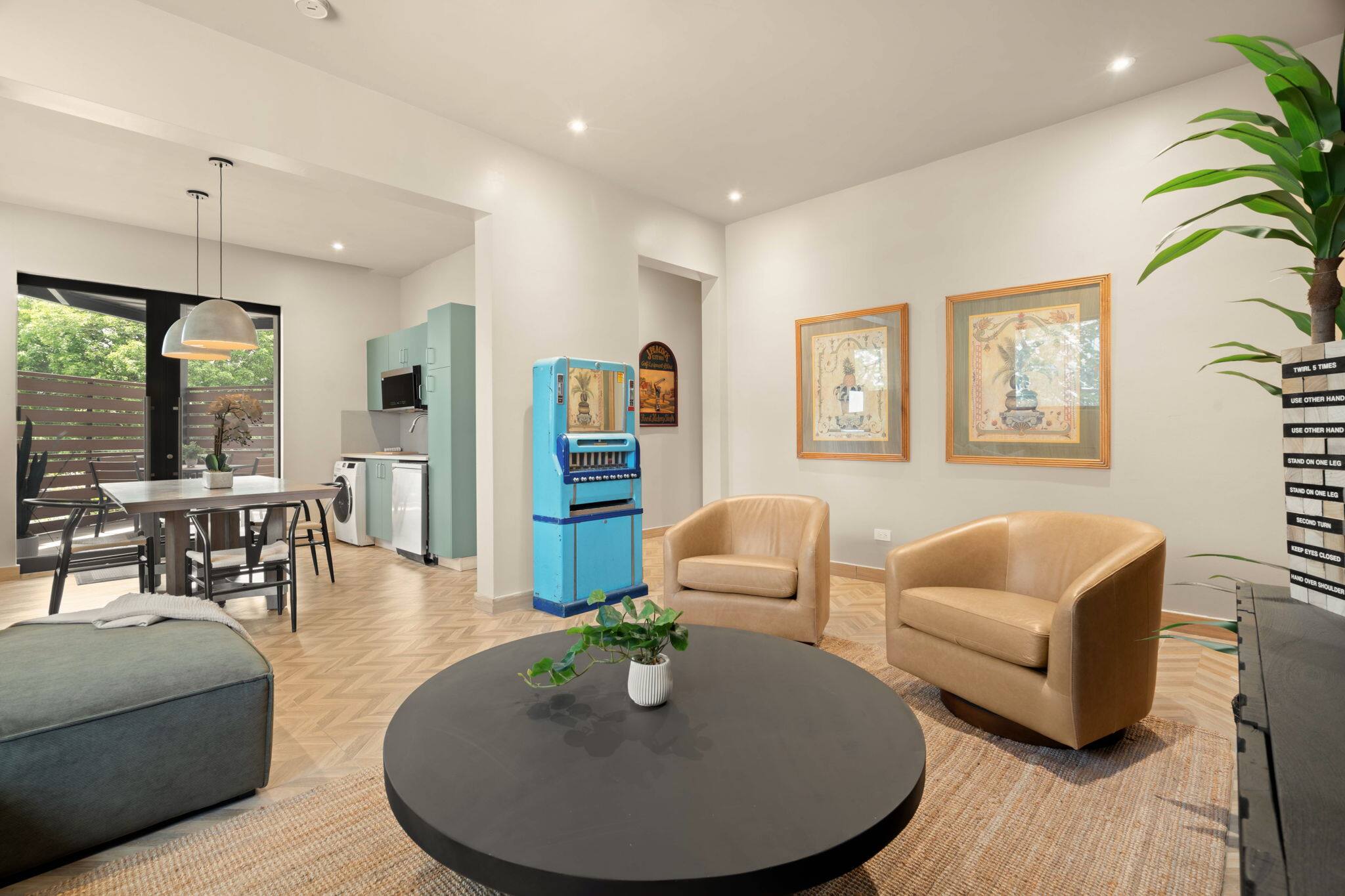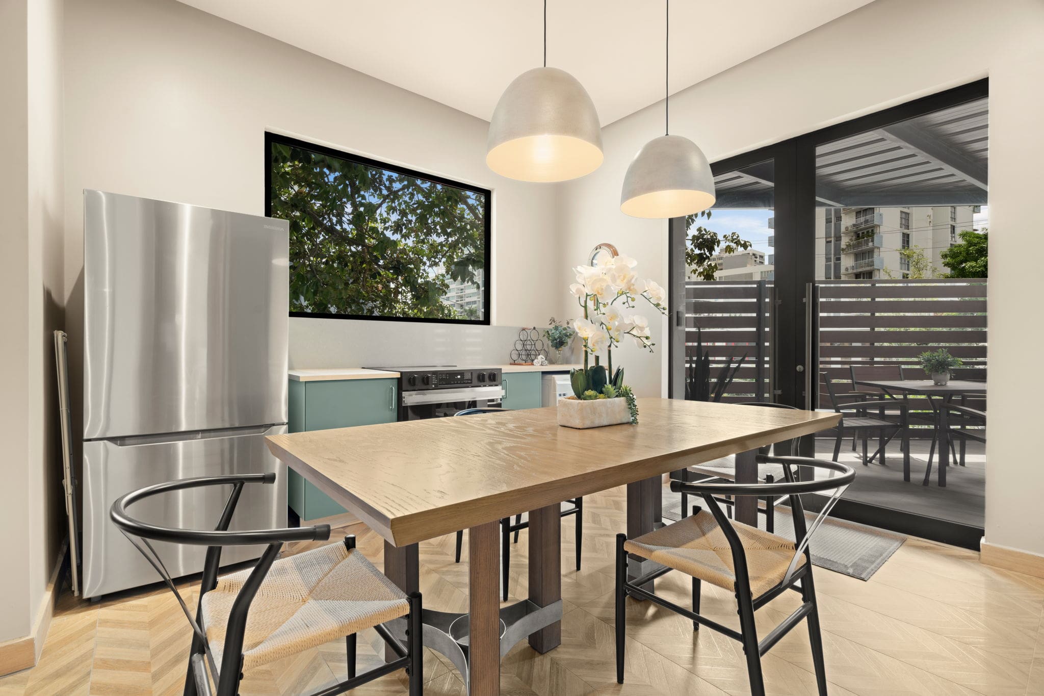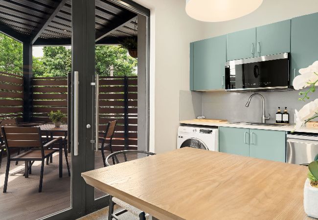 This spacious three-bedroom, two-story apartment is designed for comfortable group stays. The first floor features a bedroom with a king bed, while the second floor includes one bedroom with two full beds and another with a queen bed, offering plenty of room for everyone. A fully equipped kitchen supports easy meal prep, and meals can be enjoyed at the dining table or on the private patio, which also includes an outdoor shower. The living area opens directly onto the patio, creating bright, seamless indoor–outdoor living.