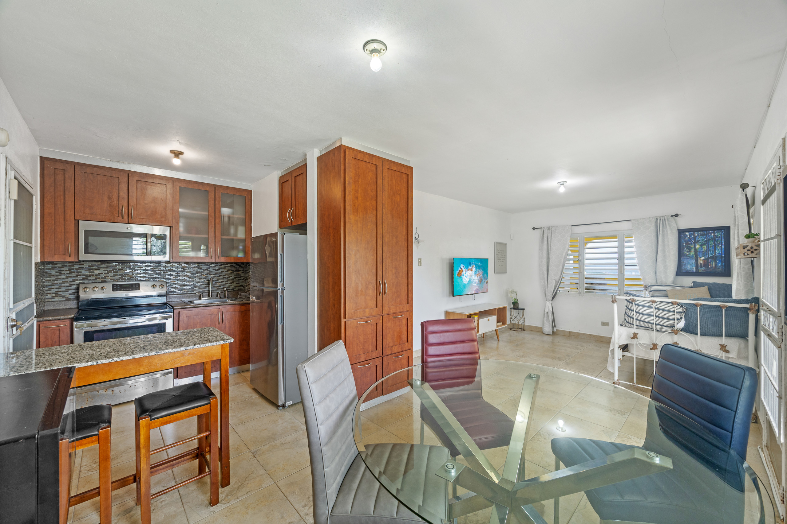 The property features two comfortable bedrooms, one full bathroom, a fully equipped indoor kitchen, and an outdoor BBQ area—ideal for cooking up a delicious meal while enjoying the fresh air. Step out onto the large covered terrace with cozy hammocks and outdoor dining, where you can savor your morning coffee as the sun rises or enjoy a sunset dinner under the sky.