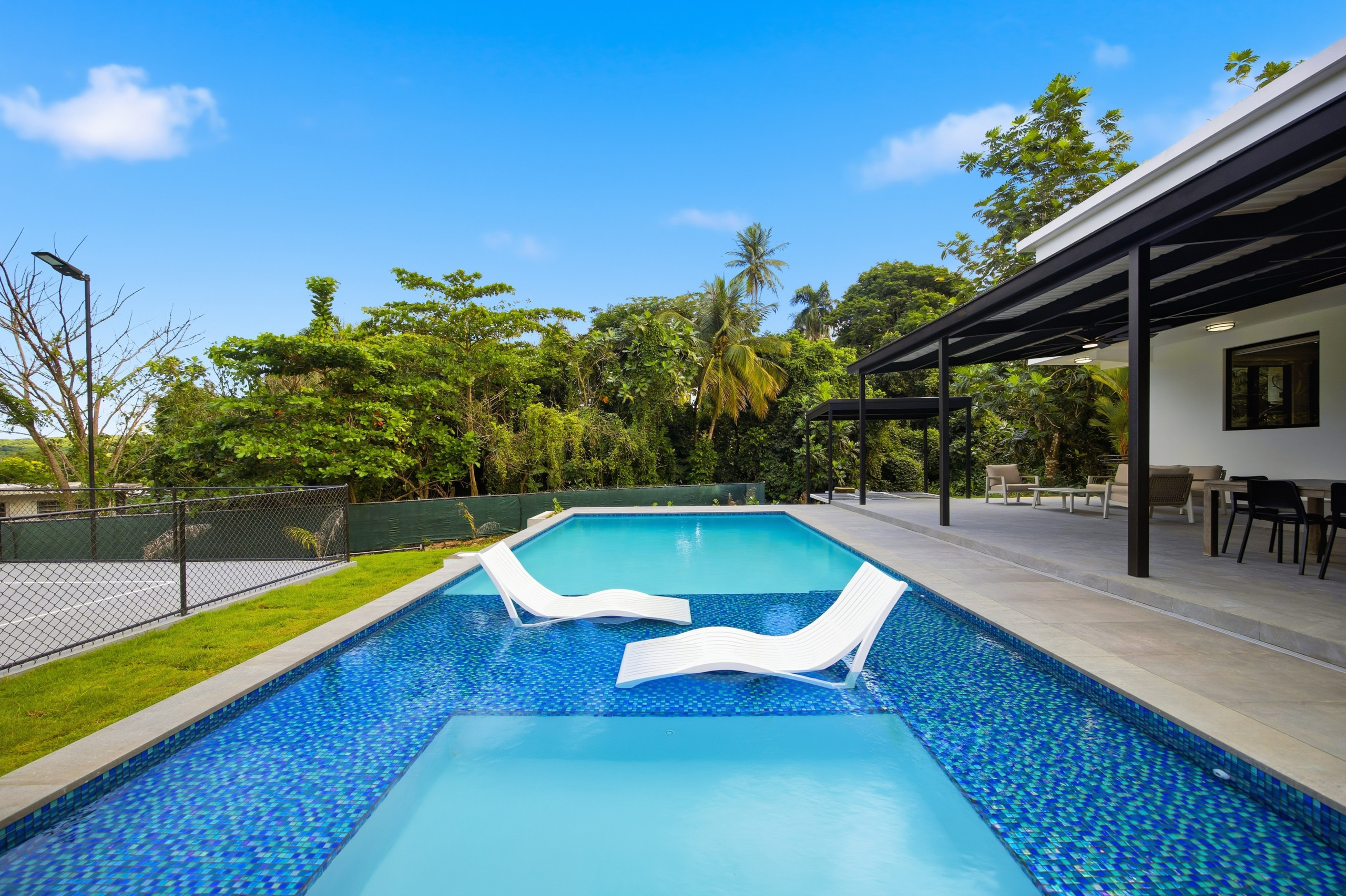 Enjoy a private swimming pool, fenced garden, terrace, balcony, and outdoor furniture—ideal for relaxing, socializing, or enjoying Puerto Rico’s year-round warm weather. The home is family-friendly, featuring a children’s play area and secure outdoor spaces.