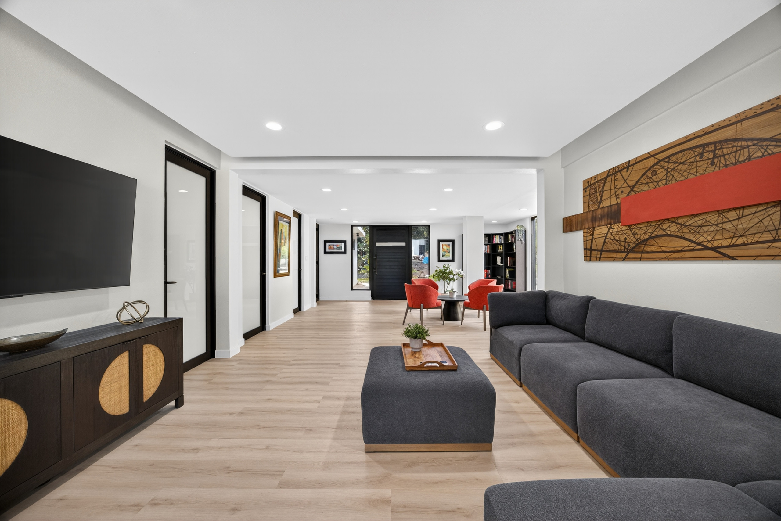 Inside, you’ll find high-speed Wi-Fi, three TVs, and comfortable common areas designed for group stays. The fully equipped electric kitchen is perfect for large groups and extended stays, offering a refrigerator, oven, microwave, freezer, coffee maker, toaster, kettle, cookware, and full dishware—everything needed to prepare meals at home.